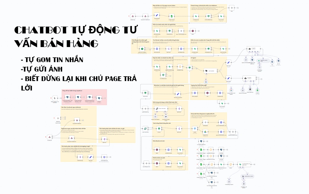 Chatbot tự động tư vấn bán hàng, lên đơn hàng là workflow được thiết kế tối ưu để giúp bạn xây dựng một chatbot AI thông minh, có thể tự động trả lời khách hàng, gửi hình ảnh sản phẩm, truy vấn tài liệu và hỗ trợ lên đơn – ngay trên fanpage Facebook – mà không cần biết lập trình.
